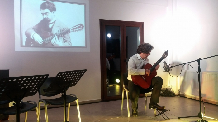 Πριν την έναρξη της εκτέλεσης των μουσικών κομματιών που είχαν επιλεγεί,οι μαθητές του τμήματος της ιστορίας της Μουσικής ,Αντωνία Καρκαλάκη,Παναγιώτης Σιούτας,και Σοφία Βάλλα παρουσίασαν στοιχεία για την ζωή και το έργο του μεγάλου κιθαρίστα .