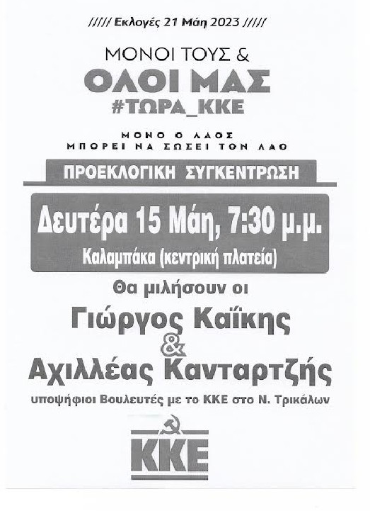 Την προεκλογική του συγκέντρωση του πραγματοποιεί το ΚΚΕ στην Καλαμπάκα την ερχόμενη Δευτέρα 15 Μάη στις 19:30 στην πλατεία Ρήγα Φεραίου.