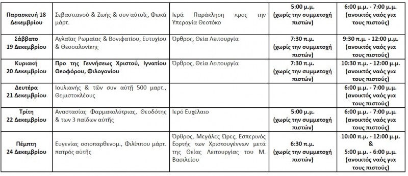 13. Την Τρίτη 22 Δεκεμβρίου στον ιερό ναό Αγίου Δημητρίου θα τελεστεί Ιερό Ευχέλαιο, χωρίς την παρουσία πιστών (5:00 μ.μ. – 6:00 μ.μ.). Στις 6:00 μ.μ. έως 7:00μ.μ. θα μπορείτε να έρθετε στον Ναό (τηρουμένων των μέτρων προστασίας) και να λάβετε λάδι για εσάς και τις οικογένειές σας. Το βαμβάκι με το λάδι θα είναι τυλιγμένο και έτοιμο να το παραλάβετε.