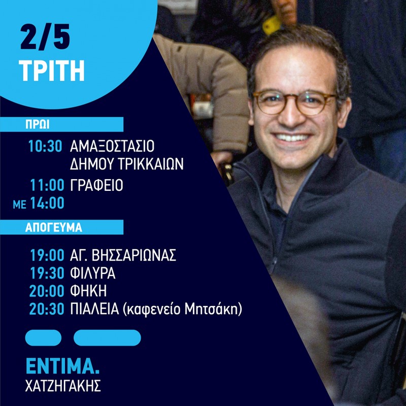 Πρόγραμμα επισκέψεων του υποψηφίου Βουλευτή της Ν.Δ. κ. Μικέλης Χατζηγάκης την Τρίτη 2 Μαίου 2023