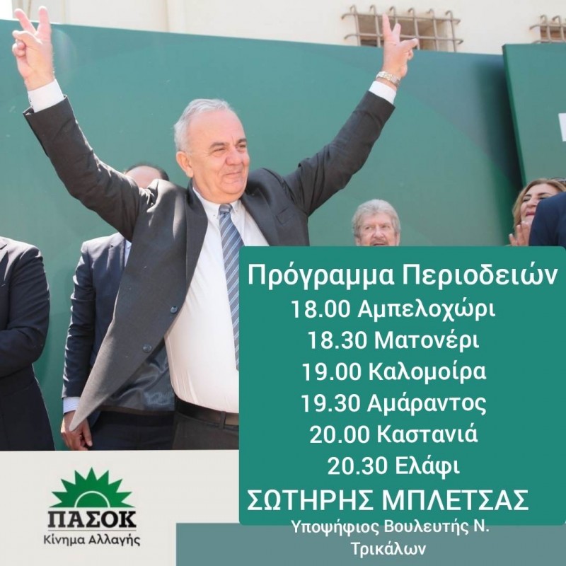 Ο υποψήφιος βουλευτής του ΠΑΣΟΚ στην Π.Ε. Τρικάλων, Σωτήρης Μπλέτσας την Τετάρτη 3 Μαΐου, το απόγευμα, θα επισκεφθεί τα ακόλουθα χωριά: