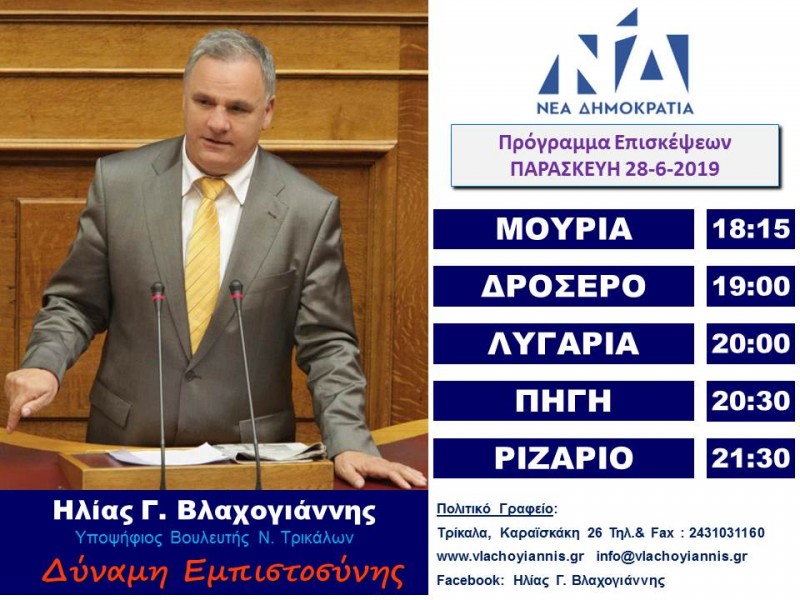 Ο Υποψήφιος Βουλευτής της Ν.Δ Νομού Τρικάλων κ. Ηλίας Βλαχογιάννης την Παρασκευή 28 Ιουνίου θα επισκεφθεί τα εξής χωριά: