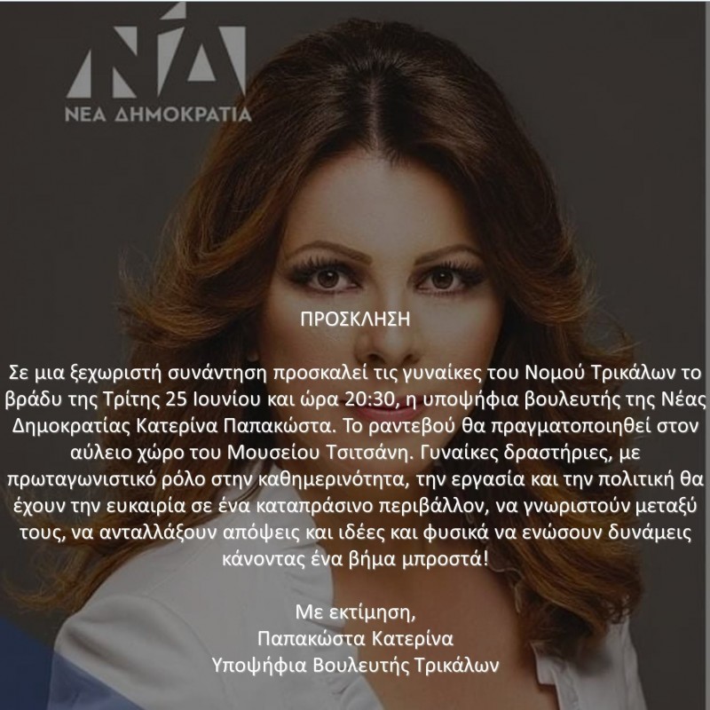 Σε μία ξεχωριστή συνάντηση προσκαλεί τις γυναίκες του Νομού Τρικάλων το βράδυ της Τρίτης 25 Ιουνίου και ώρα 20:30 η Υποψήφια Βουλευτής της Νέας Δημοκρατίας Κατερίνα Παπακώστα.