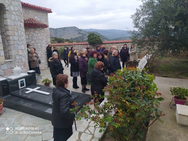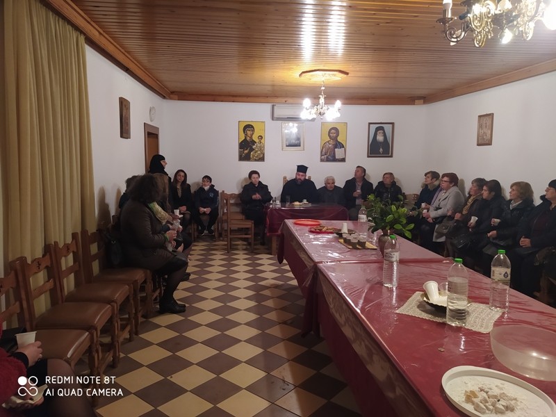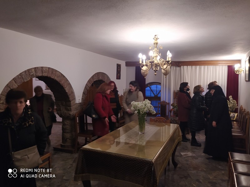 Στη συνέχεια η αδελφή Ιωσηφία προσέφερε φιλοξενία προς όλους μας και μας μίλησε για το ιστορικό της Ιεράς Μονής όπου εγκαταβιούν τέσσερις αδελφές. Μετά τη φιλοξενία μας ξενάγησε στους χώρους της Ιεράς Μονής και στον παλαιό Ιερό Ναό.