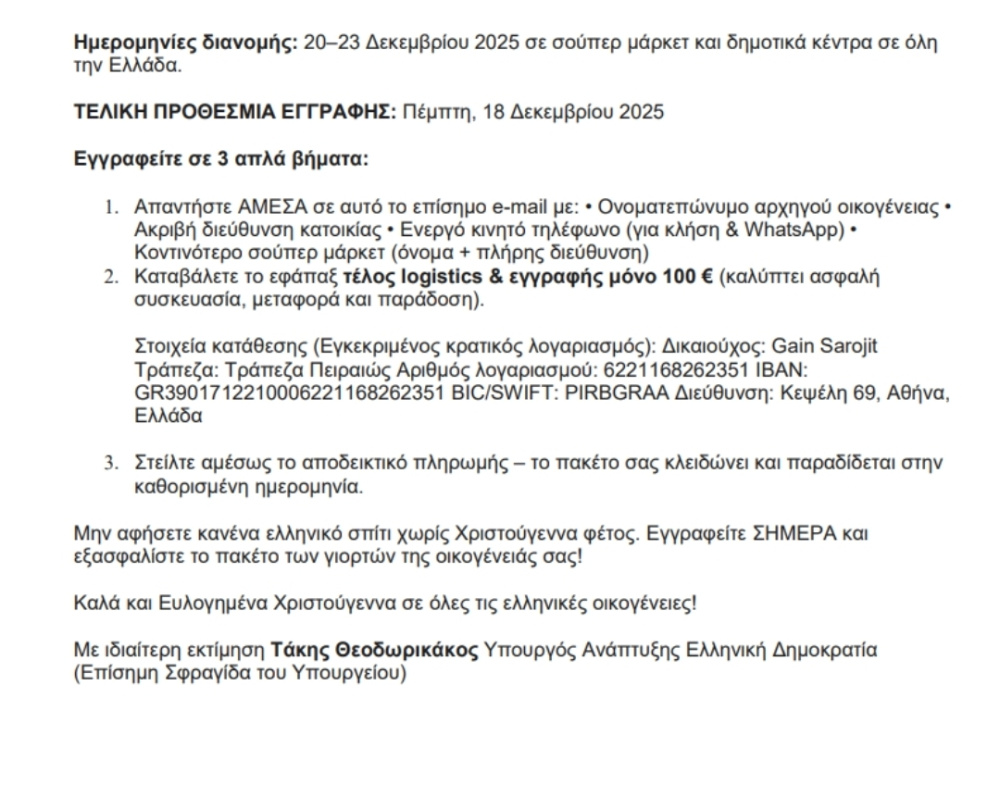 Ακόμη ένα παραπλανητικό e-mail εντοπίστηκε να διακινείται τις τελευταίες μέρες, αυτή τη φορά έχοντας τη μορφή δήθεν κρατικού προγράμματος που υπόσχεται δωρεάν γιορτινό πακέτο από το Υπουργείο Ανάπτυξης με τον τίτλο «Χριστουγεννιάτικη Διάσωση Οικογένειας 2025».