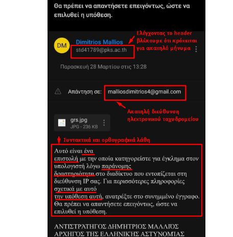 Ακόμη ένα απατηλό μήνυμα ηλεκτρονικού ταχυδρομείου εντοπίστηκε να κυκλοφορεί ως δήθεν επιστολή του Αρχηγού της Ελληνικής Αστυνομίας, Αντιστράτηγου Δημήτριου Μάλλιου, με το οποίο καλούνται οι αποδέκτες του να «δώσουν εξηγήσεις» για δήθεν εμπλοκή τους σε παράνομες πράξεις στο διαδίκτυο.