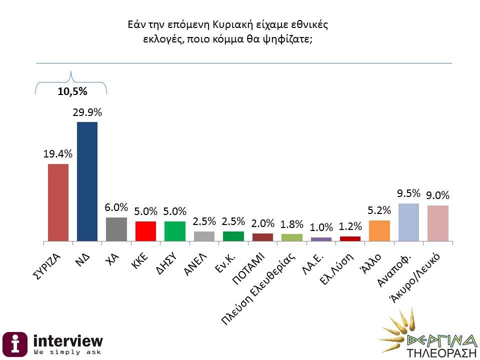 Προβάδισμα 10,5 μονάδων έναντι του ΣΥΡΙΖΑ διατηρεί η ΝΔ, σύμφωνα με δημοσκόπηση της εταιρείας Interview για την Βεργίνα Τηλεόραση.