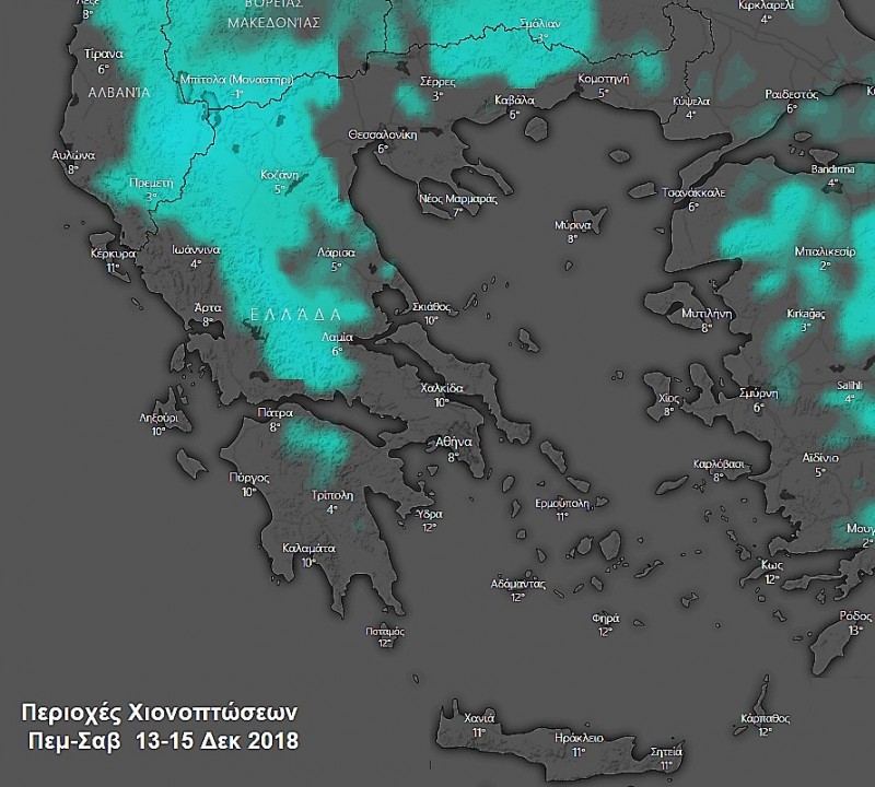 Χιόνια θα πέσουν στα ορεινά της Πελοποννήσου, της Στερεάς, και στα ορεινά και σε ημιορεινά της Ηπείρου, της Θεσσαλίας, της Μακεδονίας και της Θράκης.