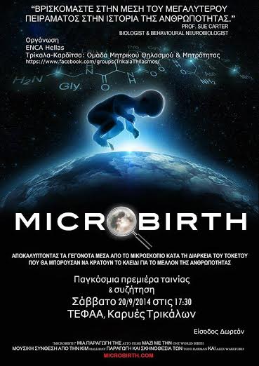 Η ομάδα «Τρίκαλα-Καρδίτσα: Ομάδα Μητρικού Θηλασμού & Μητρότητας» και το δίκτυο για τον σεβασμό στη Γέννα, ENCA Hellas, σας καλεί αυτό το Σάββατο 20 Σεπτεμβρίου 2014 στις 17.30 στην αίθουσα συνεδριάσεων της ΣΕΦΑΑ (ΤΕΦΑΑ) στις Καρυές Τρικάλων, για την προβολή της ταινίας “microbirth”.