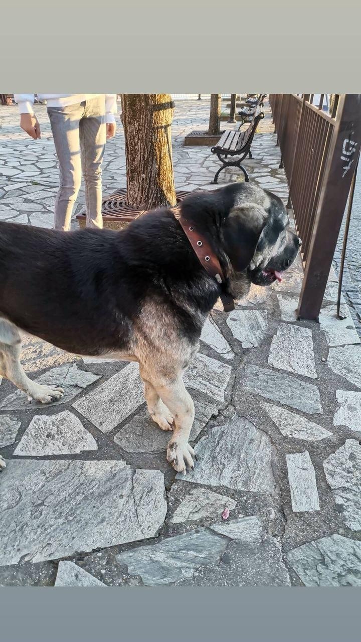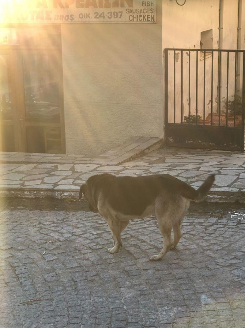 Ο συγκεκριμένος σκύλος φέρει περιλαίμιο και βρίσκεται έξω από το κρεοπωλείο “Ζαρακότα” στο Καστράκι.