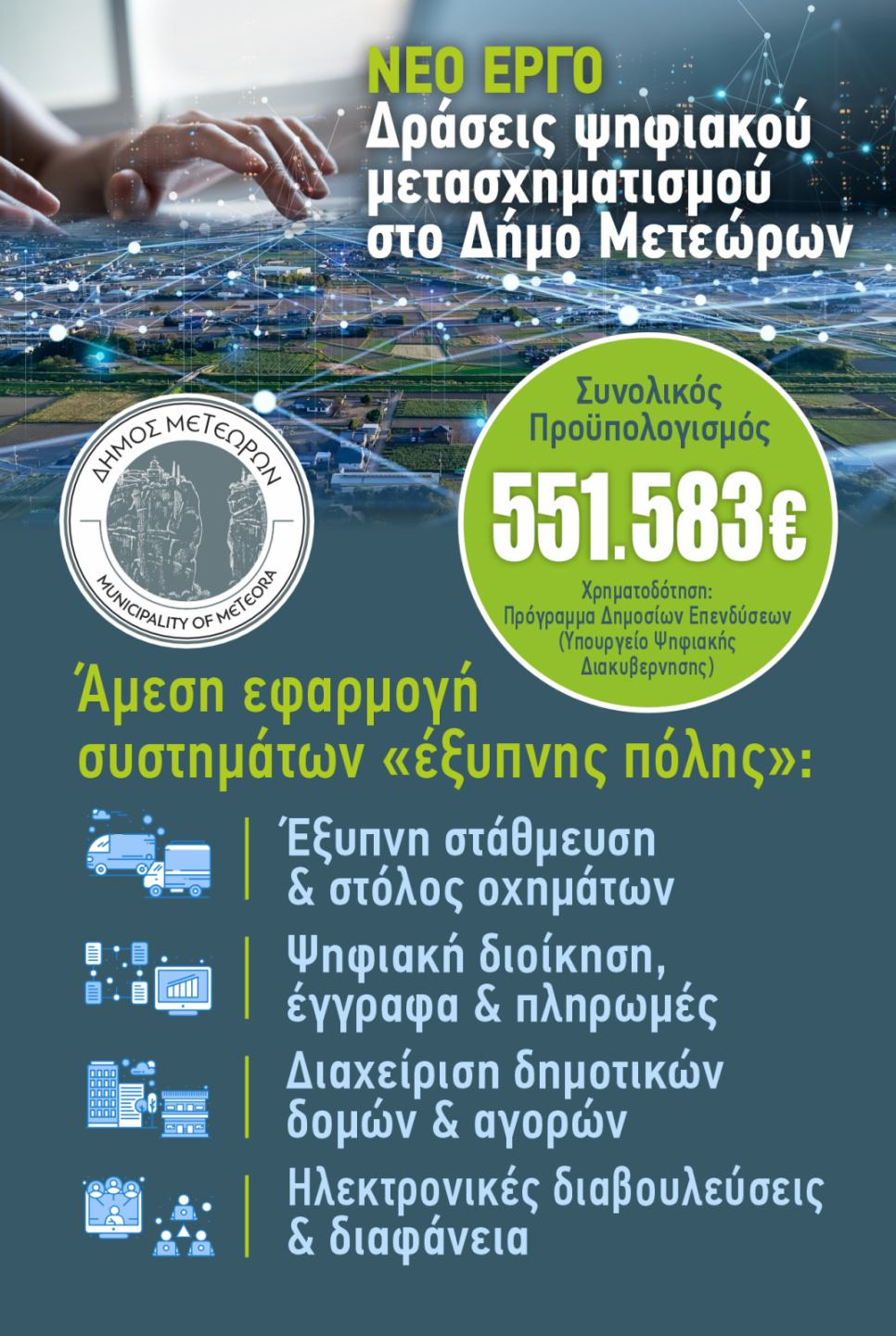Με απόφαση του Υπουργού Ψηφιακής Διακυβέρνησης Δημήτρη Παπαστεργίου, εντάχθηκε στο Πρόγραμμα Δημοσίων Επενδύσεων το έργο «Δράσεις Ψηφιακού Μετασχηματισμού στο Δήμο Μετεώρων», συνολικού προϋπολογισμού 551.583 €, με χρηματοδότηση από το Υπουργείο Ψηφιακής Διακυβέρνησης. Το έργο αποτελεί ένα ολοκληρωμένο πακέτο παρεμβάσεων «έξυπνης πόλης», που αναβαθμίζει τις ψηφιακές υποδομές και τις παρεχόμενες υπηρεσίες του Δήμου Μετεώρων, με στόχο τη βελτίωση της καθημερινότητας των πολιτών, την ενίσχυση της διαφάνειας και την αποτελεσματικότερη λειτουργία των δημοτικών υπηρεσιών.