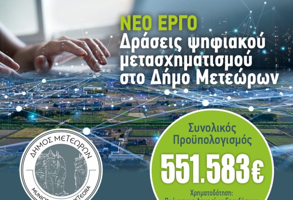 Με απόφαση του Υπουργού Ψηφιακής Διακυβέρνησης Δημήτρη Παπαστεργίου, εντάχθηκε στο Πρόγραμμα Δημοσίων Επενδύσεων το έργο «Δράσεις Ψηφιακού Μετασχηματισμού στο Δήμο Μετεώρων», συνολικού προϋπολογισμού 551.583 €, με χρηματοδότηση από το Υπουργείο Ψηφιακής Διακυβέρνησης. Το έργο αποτελεί ένα ολοκληρωμένο πακέτο παρεμβάσεων «έξυπνης πόλης», που αναβαθμίζει τις ψηφιακές υποδομές και τις παρεχόμενες υπηρεσίες του Δήμου Μετεώρων, με στόχο τη βελτίωση της καθημερινότητας των πολιτών, την ενίσχυση της διαφάνειας και την αποτελεσματικότερη λειτουργία των δημοτικών υπηρεσιών.