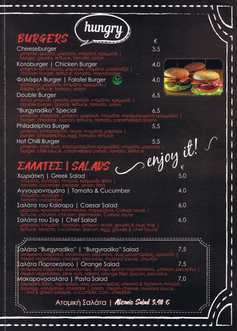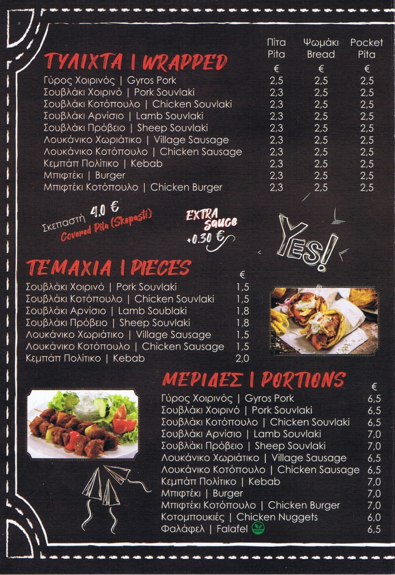 Γύρος, σουβλάκι, λουκάνικο, μπιφτέκι, ποικιλία από Burgers, σαλάτες, κ.α. σας περιμένουν να τα απολαύσετε με τις υπηρεσίες TAKE AWAY ή DELIVERY στο τηλέφωνο 24320 77434.