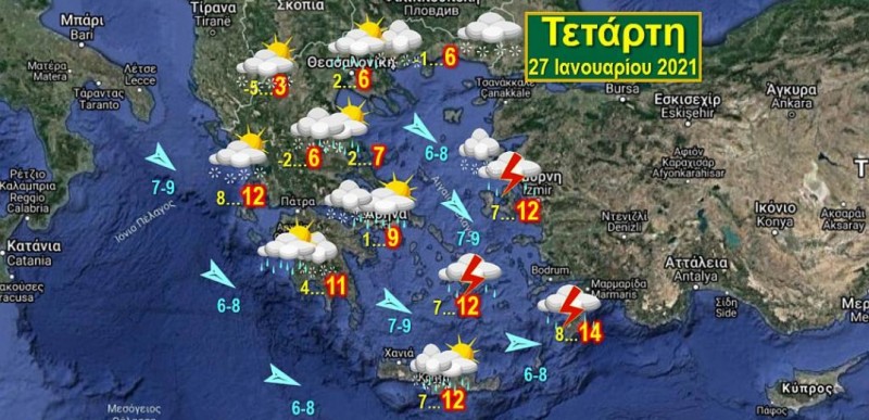 Τετάρτη, 27-1-2021 Στο Ιόνιο, την Ήπειρο, τη δυτική-κεντρική Μακεδονία, τη Θεσσαλία, τη Στερεά, την Εύβοια και την Πελοπόννησο, συννεφιά, λίγες βροχές, λίγα χιόνια στα ορεινά-ημιορεινά και βελτίωση με διαστήματα ηλιοφάνειας. Στην ανατολική Μακεδονία και τη Θράκη χιονοπτώσεις στα ορεινά-ημιορεινά και σε πεδινά, εντονότερες στη Θράκη. Στα νησιά του βόρειου και ανατολικού Αιγαίου, τις Κυκλάδες, την Κρήτη και τα Δωδεκάνησα, βροχές, σποραδικές καταιγίδες και χιόνια στα ορεινά και σε χαμηλότερα υψόμετρα.