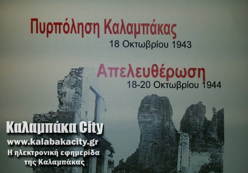 Την Κυριακή 19 Οκτωβρίου 2014 θυμόμαστε και τιμάμε την Πυρπόληση της πόλης μας της Καλαμπάκας στις 18 Οκτωβρίου 1943 και την Απελευθέρωσή της από το γερμανικό ζυγό στις 18-20 Οκτωβρίου 1944.