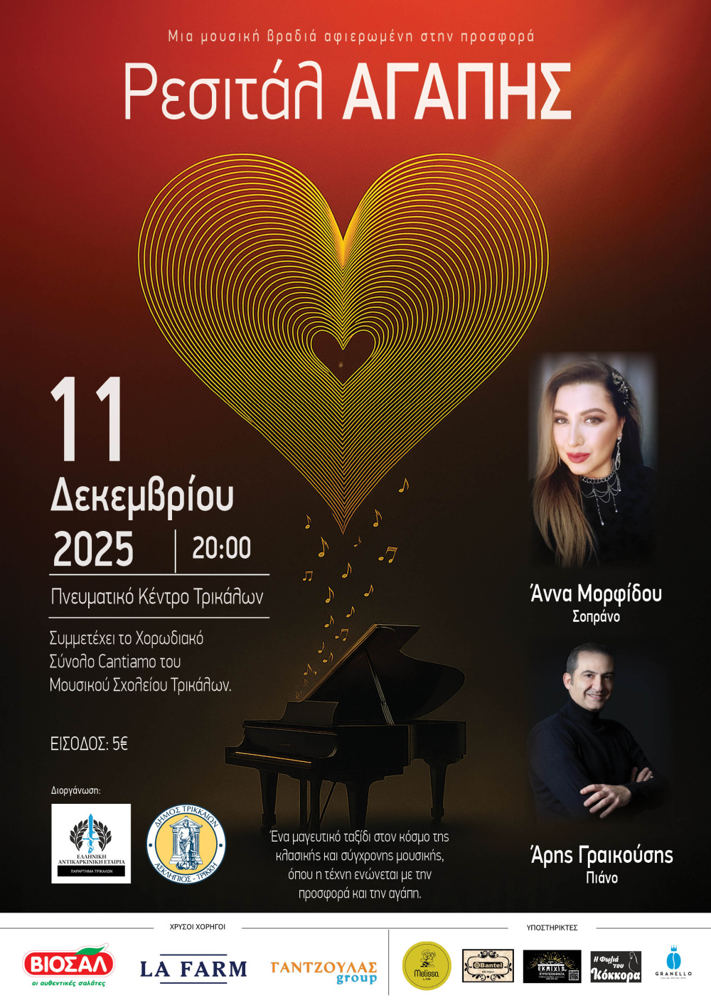 Η σπουδαία Τρικαλινή σοπράνο Άννα Μορφίδου, της οποίας η φωνή αγγίζει βαθιά την ψυχή με την αισθαντικότητά της, και ο Άρης Γραικούσης, πιανίστας που μεταμορφώνει τις νότες σε ζωντανά συναισθήματα.