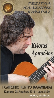 Το Θεατρικό Εργαστήρι “Επί Σταγών” στηρίζει τους ανθρώπους του και σας προσκαλεί την Κυριακή των Βαΐων, 28 Απριλίου 2013 στο Πολιτιστικό Κέντρο Καλαμπάκας και ώρα 21:00 σε μια μουσική συνάντηση με τον Κώστα Δριτσέλη να ερμηνεύει έργα κλασικής κιθάρας.