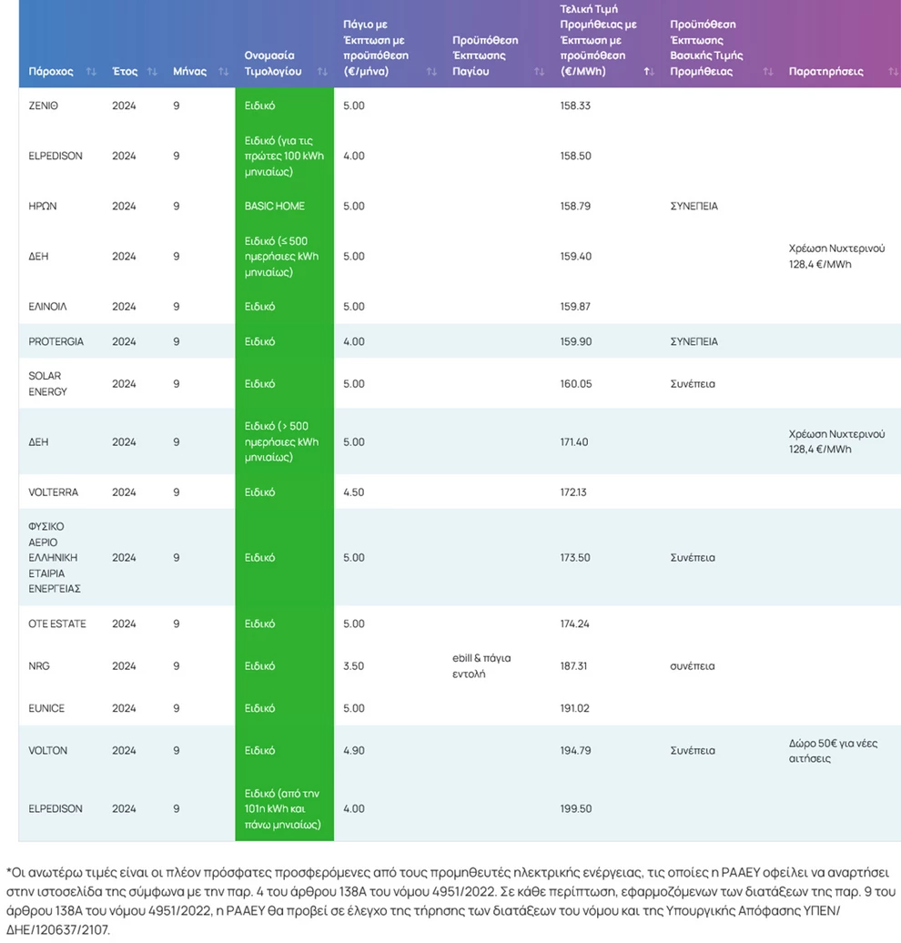 Το πράσινο τιμολόγιο της ΔΕΗ που είναι ο μεγαλύτερος προμηθευτής είναι 15,94 σεντς ανά κιλοβατώρα (από 16,39 τον Αύγουστο) για κατανάλωση έως 500 κιλοβατώρες το μήνα και 17,14 σεντς (από 16,95 τον Αύγουστο) για την υπερβάλλουσα κατανάλωση. Το νυχτερινό ανέρχεται στα 12,84 σεντς (από 14,93 τον Αύγουστο).