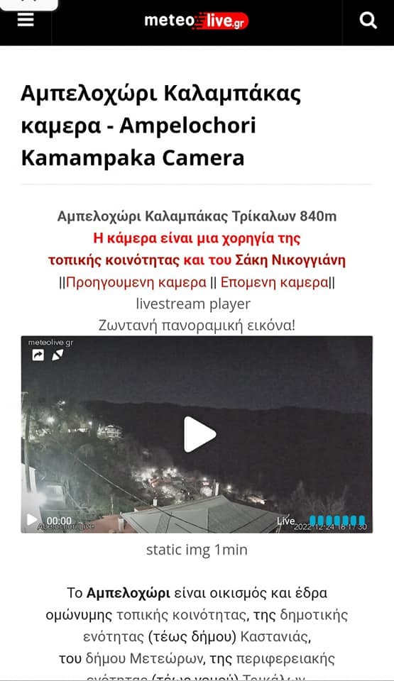 Με δική μου πρωτοβουλία και σε συνεργασία με τον Χρήστο Δημητρούλη και την ιστοσελίδα meteolive.gr , τοποθετήθηκε μετεωρολογική κάμερα που μεταδίδει ζωντανά τις υπάρχουσες καιρικές συνθήκες. Η κάμερα αυτή αποτελεί τμήμα ενός ευρύτερου πανελλήνιου μετεωρολογικού δικτύου που μετρά πάνω από 100 εν λειτουργία κάμερες, σε συνεργασία με το Εθνικό Αστεροσκοπείο Αθηνών και συμβάλλει στην γενικότερη μετεωρολογική εικόνα που επικρατεί στον Ελλαδικό χώρο.