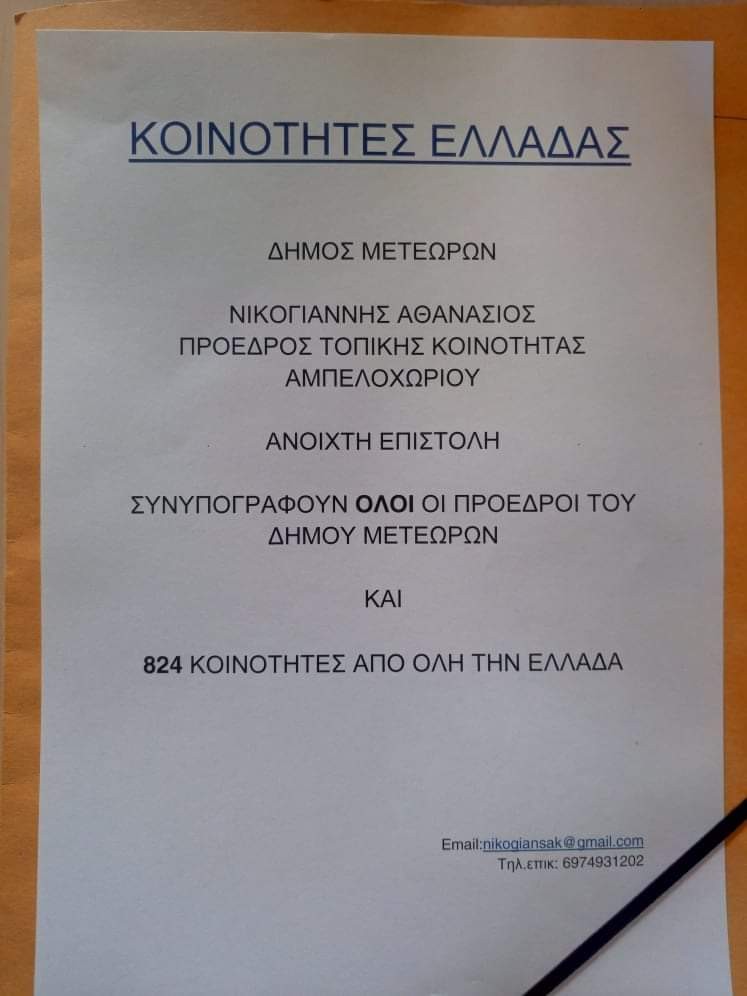 Σύμφωνα με το trikalafocus.gr ο δυναμικός πρόεδρος παρέδωσε στον Κυριάκο Μητσοτάκη την επιστολή που υπογράφουν οι πρόεδροι από 824 κοινότητες, με την οποία ζητούν να μην καταργηθεί η εκλογή προέδρου των Τοπικών Κοινοτήτων με ξεχωριστή κάλπη.