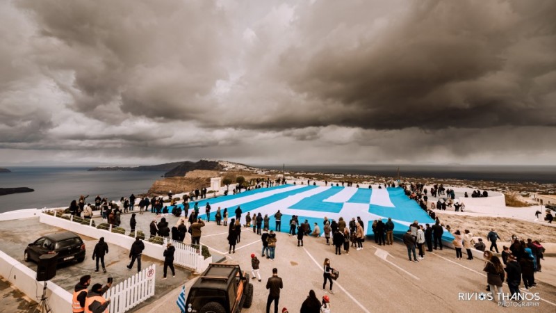 Η μεγαλύτερη σημαία στην ελληνική επικράτεια έκανε την εμφάνισή της σήμερα το πρωί στην Σαντορίνη, ανήμερα της εθνικής μάς επετείου 25ης Μαρτίου, με αφορμή τη συμπλήρωση 200 ετών από την Επανάσταση του 1821.
