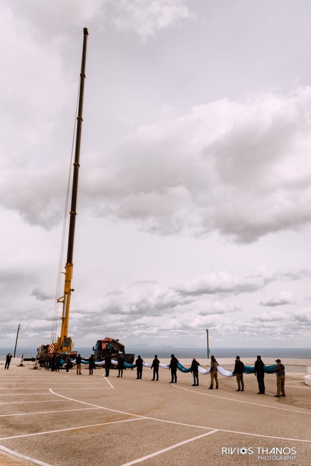Οι συμμετέχοντες κατέβαλαν υπεράνθρωπες προσπάθειες για την ανάρτηση της σημαίας γίγας με τη συνδρομή και μεγάλου καλαθοφόρου μηχανήματος. Η σημαία κυμάτισε για περίπου δύο λεπτά, όμως δεν έγινε κατορθωτό να υψωθεί στον πελώριο ιστό καθώς οι ισχυροί άνεμοι και το μεγάλο της βάρος έσχισαν ένα σημαντικό της μέρος.