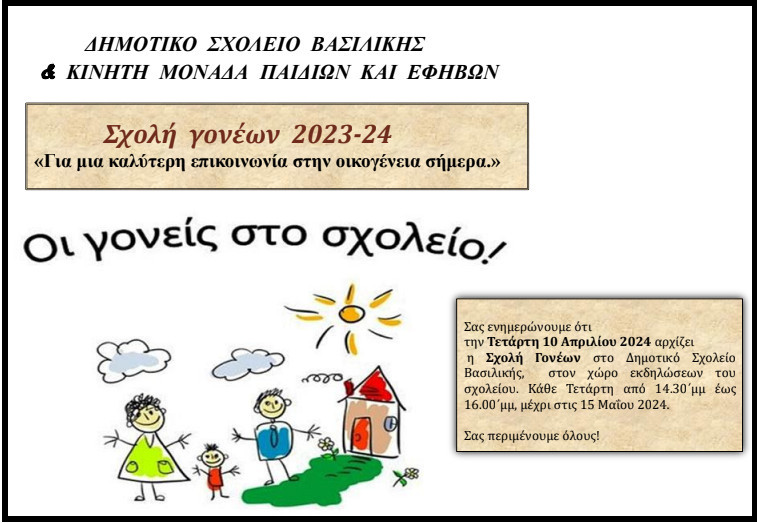 Το ΔΗΜΟΤΙΚΟ ΣΧΟΛΕΙΟ ΒΑΣΙΛΙΚΗΣ σε συνεργασία με την ΚΙΝΗΤΗ ΜΟΝΑΔΑ ΠΑΙΔΙΩΝ ΚΑΙ ΕΦΗΒΩΝ & ΤΟ ΚΕΝΤΡΟ ΗΜΕΡΑΣ ΠΑΙΔΙΩΝ ΚΑΙ ΕΦΗΒΩΝ οργανώνουν και θα υλοποιήσουν ΣΧΟΛΗ ΓΟΝΕΩΝ στον χώρο του σχολείου.