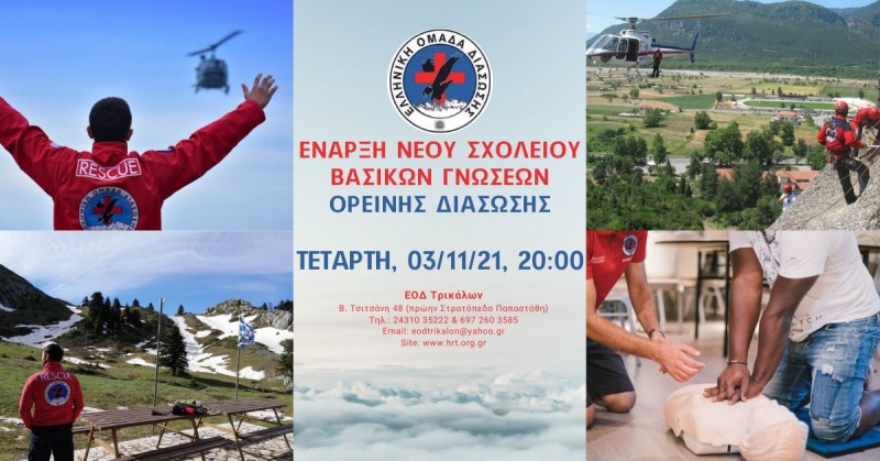 Η Ελληνική Ομάδα Διάσωσης (ΕΟΔ) Νομού Τρικάλων διοργανώνει Σχολή Βασικής Εκπαίδευσης στην ορεινή διάσωση για νέα μέλη.