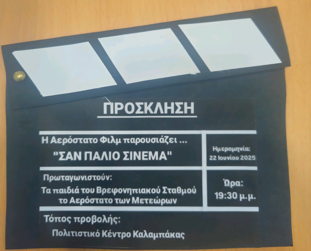 Ο Βρεφονηπιακός σταθμός “Το Αερόστατο των Μετεώρων ” σας προσκαλεί με ιδιαίτερη χαρά στην σχολική μας εκδήλωση με τίτλο: “Αφιέρωμα στον Ελληνικό Κινηματογράφο” που θα πραγματοποιηθεί την Κυριακή 22 Ιουνίου 2025 , στις 19:30 μ.μ. στο Πολιτιστικό Κέντρο Καλαμπάκας.
