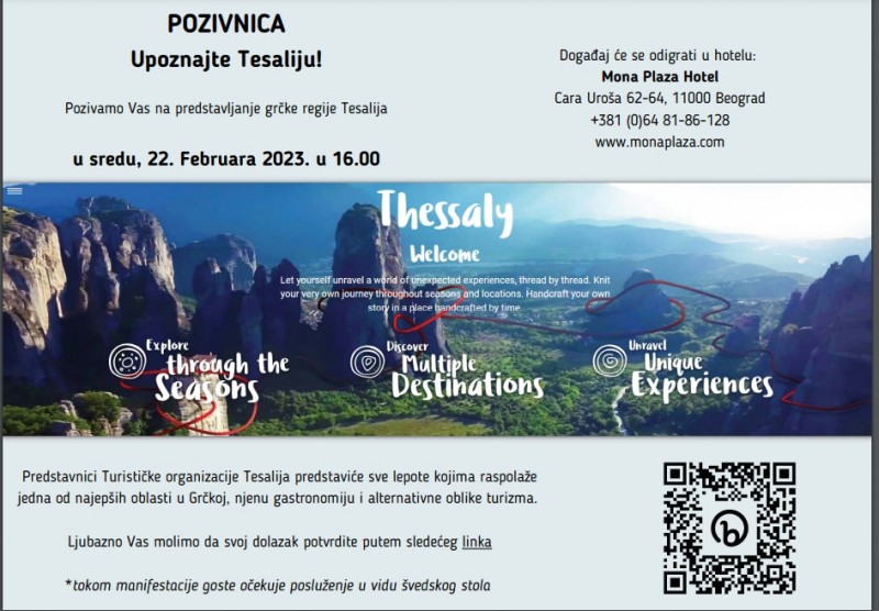 Τη συμμετοχή της σε  ένα  workshop και σε τέσσερις διεθνείς  εκθέσεις προετοιμάζει τις επόμενες ημέρες η Περιφέρεια Θεσσαλίας στο πλαίσιο του προγράμματος   τουριστικής προβολής  που βρίσκεται σε εξέλιξη. Συγκεκριμένα την Τετάρτη 22 Φεβρουαρίου,  η Περιφέρεια Θεσσαλίας συμμετέχει σε  workshop στο Βελιγράδι, στο ξενοδοχείο Mona Plaza,  με προσκεκλημένους επαγγελματίες του τουρισμού και εκπρόσωπους  φορέων  οι οποίοι θα έχουν Β2Β συναντήσεις με τουριστικά γραφεία κι επαγγελματίες της Σερβίας.