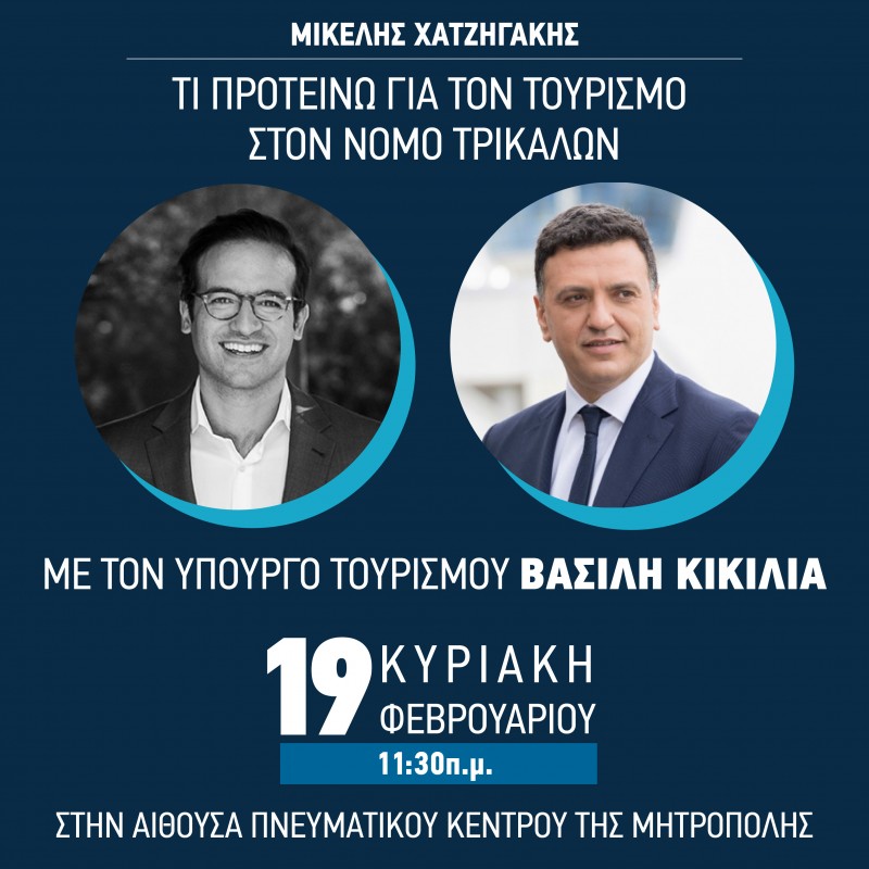 Θεματική εκδήλωση για τον Τουρισμό και τις προοπτικές του στην Π.Ε. Τρικάλων διοργανώνει στις 19 Φεβρουαρίου στην αίθουσα του Πνευματικού Κέντρου της Μητροπόλεως Τρίκκης, Γαρδικίου και Πύλης (οδός Απόλλωνος) ο κ. Μικέλης Χατζηγάκης.