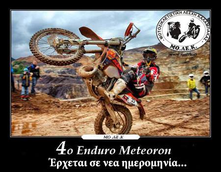 Δυστυχώς ο συνεχιζόμενος άσχημος καιρός στην περιοχή της Καλαμπάκας μας υποχρεώνει να μεταφέρουμε την ημερομηνία διεξαγωγής του 4ου Εnduro Meteorοn σε νέα ημερομηνία την άνοιξη,η οποία θα ανακοινωθεί σύντομα.