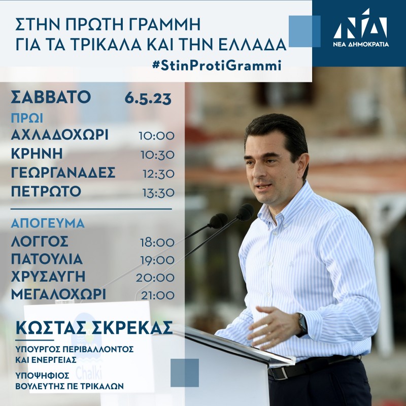 Ο Υπουργός Περιβάλλοντος και Ενέργειας και υποψήφιος βουλευτής Π.Ε. Τρικάλων, Κώστας Σκρέκας, το Σάββατο 6 Μαΐου, θα επισκεφθεί τα ακόλουθα χωριά: