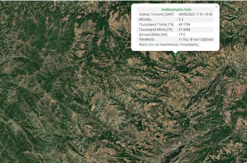 Σεισμική δόνηση μεγέθους 3.3 της κλίμακας ρίχτερ σημειώθηκε στις 20:51 με επίκεντρο 11χλμ Β της πόλης των Γρεβενών .