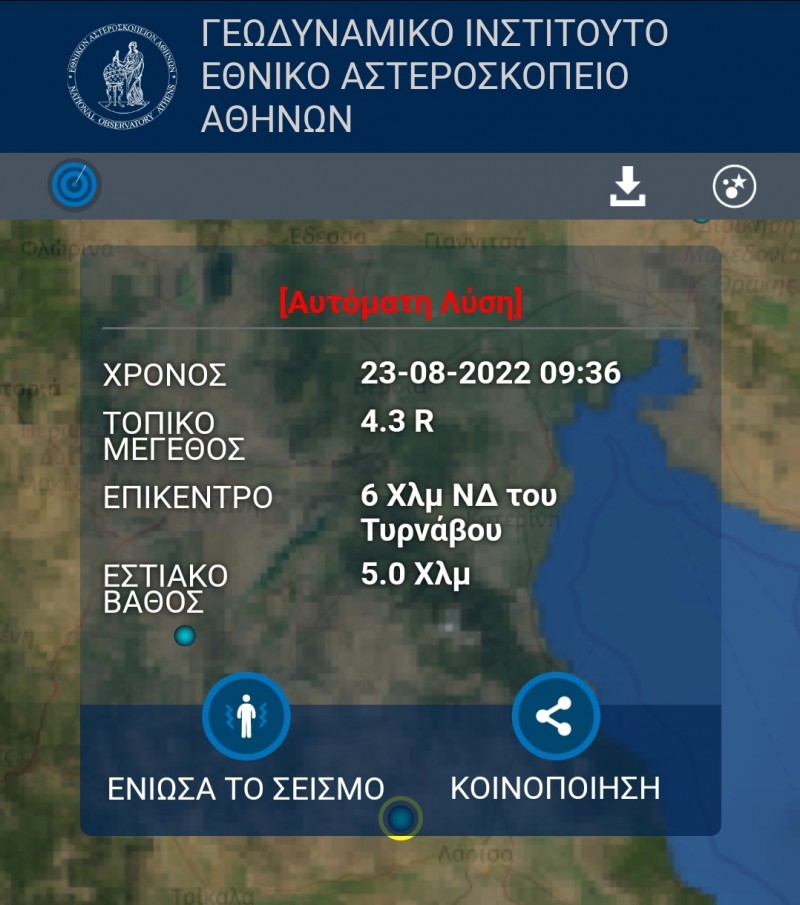 Σεισμική δόνηση 4,3 Ρίχτερ στον Τύρναβο αισθητή στην Καλαμπάκα Τοπικές Ειδήσεις Από admin Δημοσίευση Αυγ 23, 2022 -9:37 0 1.279 Κοινοποίηση FacebookTwitterΗλεκτρονικό ΤαχυδρομείοViber Σεισμική δόνηση σημειώθηκε σήμερα στις 09:43 το πρωί έγινε αισθητή στην Καλαμπάκα. Η σεισμική δόνηση ήταν μεγέθους 4,3 Ρίχτερ στην περιοχή του Τυρνάβου 0 1.279 Κοινοποίηση