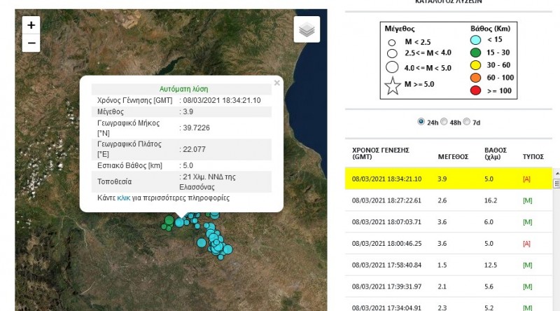 Η σεισμική δόνηση είχε μέγεθος 3.9 Ρίχτερ και σημειώθηκε 21 χλμ ΝΝΔ της Ελασσόνας.