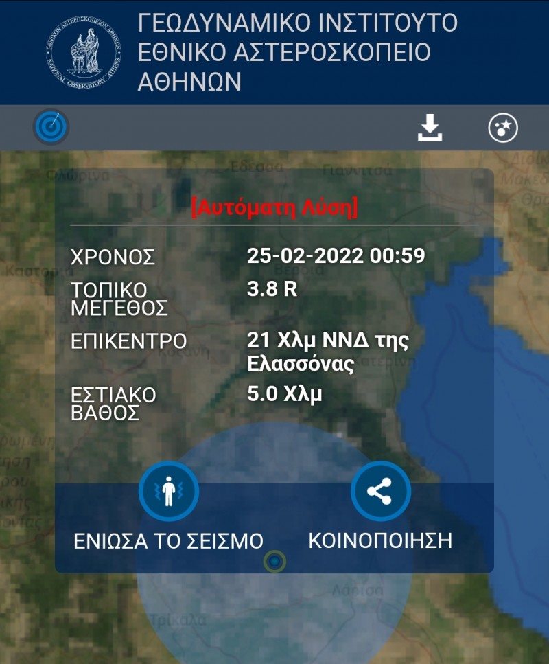 Σύμφωνα με τα πρώτα στοιχεία η σεισμική δόνηση έγινε στην περιοχή της Ελασσόνας και είχε μέγεθος 3.6 με 3,8 Ρίχτερ