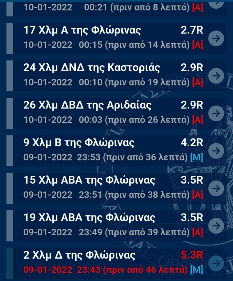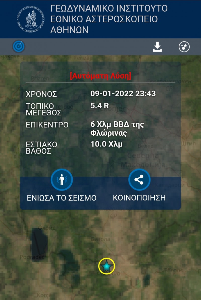 Σύμφωνα με τα πρώτα στοιχεία η σεισμική δόνηση που έγινε αισθητή στην περιοχή μας έγινε 5 – 6 χλμ από την Φλώρινα μεγέθους 5,4 ( 5,3 διόρθωση) Ρίχτερ.