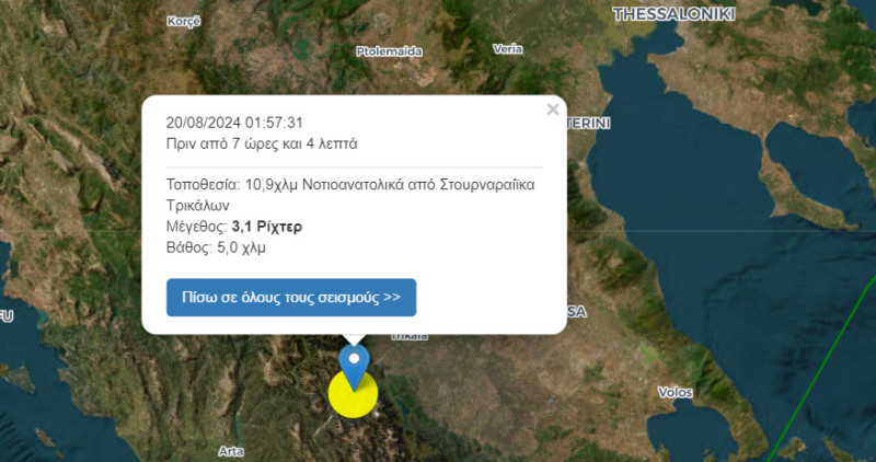 Σεισμός μεγέθους 3,1 βαθμών της Κλίμακας Ρίχτερ σημειώθηκε τα ξημερώματα της Τρίτης στα Στουρναραίικα Τρικάλων