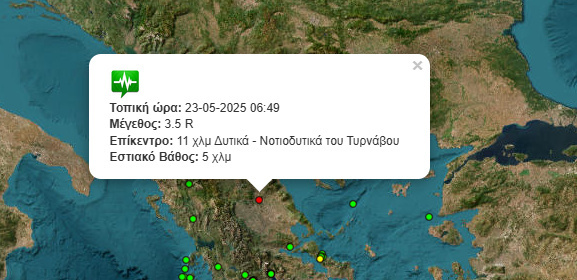 Σεισμός μεγέθους 3,5 βαθμών της κλίμακας Ρίχτερ σημειώθηκε σήμερα στις 06:49 το πρωί 11 χλμ Δυτικά – Νοτιοδυτικά του Τυρνάβου με εστιακό βάθος 5 χλμ.
