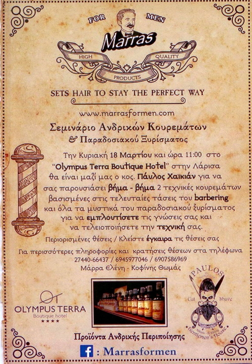 Την Κυριακή 18 Μαρτίου και ώρα 11:00 στο “Olympus Terra Boutique Hotel” στην Λάρισα θα είναι μαζί μας ο κος Πάυλος Χαϊκιάν για να σας παρουσιάσει βήμα – βήμα δύο τεχνικές κουρεμάτων βασισμένες στις τελευταίες τάσεις του barbering και όλα τα μυστικά του παραδοσιακού ξυρίσματος για να εμπλουτίσετε τις γνώσεις σας και να τελειοποιήσετε την τεχνική σας.