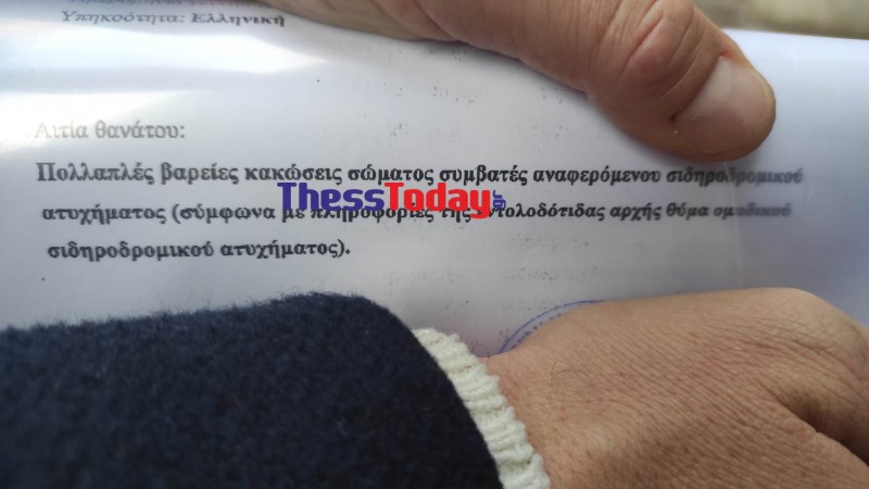 Το ThessToday.gr αποκαλύπτει το ιατρικό έγγραφο στο οποίο αναγράφεται η αιτία θανάτου για όλους τους νεκρούς, ενώ εντύπωση προκαλεί το γεγονός ότι η τραγωδία αποκαλείται ως «σιδηροδρομικό ατύχημα».