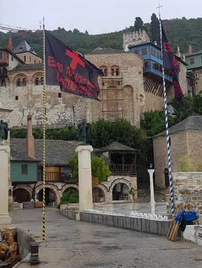 Μαύρες σημαίες που αναγράφουν ”Έξω οι Αντίχριστοι από το Άγιον Όρος” κυματίζουν από χθες Τρίτη στην Ιερά Μονή Δοχειαρίου Αγίου Όρους.