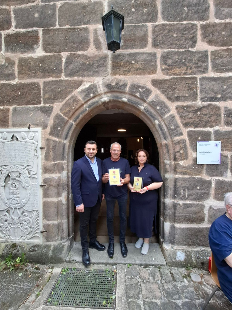Στο πλαίσιο της ενεργούς Διπλωματίας Πόλεων που υλοποιεί ο Δήμος Μετεώρων με στόχο την ενίσχυση της αναγνωρισιμότητας και του προφίλ εξωστρέφειας του Δήμου μέρος της ελληνικής αποστολής επισκέφτηκε την Νυρεμβέργη. Εκεί η αντιπροσωπεία εκκλησιάστηκε στον Ιερό Ναό Αποστόλου Παύλου όπου διακονεί ο συμπατριώτης μας πατήρ Σωτήριος Τσουρλής. Ο Δήμαρχος Μετεώρων είχε την ευκαιρία να απευθυνθεί στο εκκλησίασμα επιβεβαιώνοντας την αγάπη του και το σεβασμό του για όλα όσα έχουν πετύχει οι ομογενείς μας στην ξενιτιά ενώ σημείωσε ότι «το μέλλον μας είναι κοινό και μαζί θα εργαστούμε για να διατηρήσουμε ζωντανά ήθη και παραδόσεις, αλλά και για να δώσουμε προοπτική στη νέα γενιά». Στον Δήμαρχο κ. Αβραμόπουλο ο εφημέριος του Ναού Πατήρ Σωτήριος Τσουρλής απέδωσε ως αναμνηστικό ένα ιστορικό λεύκωμα του ναού. Η ξενάγηση στην πόλη της Νυρεμβέργης ολοκληρώθηκε με την επίσκεψη στο Δικαστικό Μέγαρο της πόλης όπου 79 χρόνια πριν διεξήχθη η διασημότερη δίκη του 20ου αιώνα, η ιστορική Δίκη της Νυρεμβέργης για τα εγκλήματα κατά της ανθρωπότητας που διέπραξαν οι Ναζί στον Δεύτερο Παγκόσμιο Πόλεμο.
