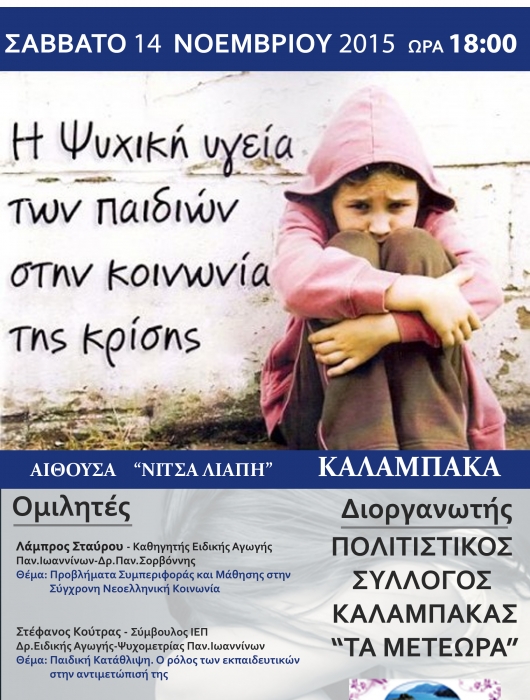 Ο Πολιτιστικός Σύλλογος Καλαμπάκας “Τα Μετέωρα” σας προσκαλεί στη διάλεξη που οργανώνει σήμερα Σάββατο 14 Νοεμβρίου 2015 και ώρα 18:00 στην αίθουσα «Νίτσα Λιάπη» με θέμα «Η ψυχική υγεία των παιδιών στην κοινωνία της κρίσης».