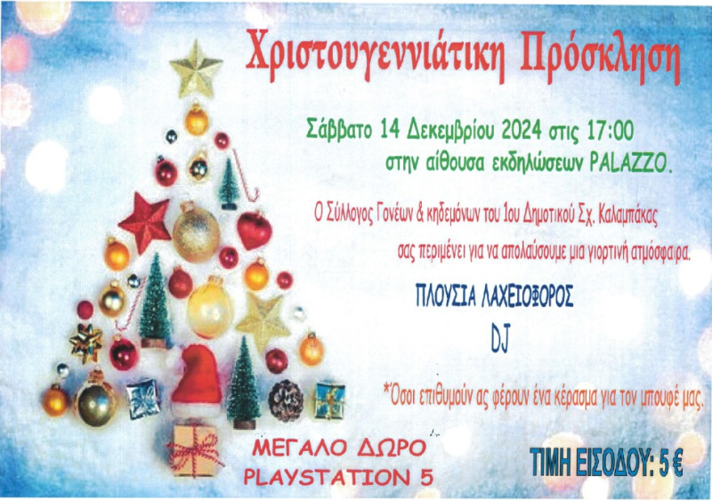 Σήμερα Σάββατο 14 Δεκεμβρίου στις 17:00 το απόγευμα θα πραγματοποιηθεί η απογευματινή Χριστουγεννιάτικη εκδήλωση του 1ου Δημοτικού Σχολείου Καλαμπάκας.
