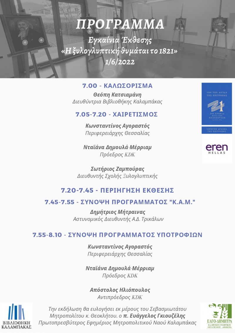 Η Βιβλιοθήκη και η Ξυλογλυπτική Σχολή Καλαμπάκας έχουν την τιμή να σας προσκαλέσουν στα εγκαίνια της έκθεσης «Η ξυλογλυπτική θυμάται το 1821» την Τετάρτη 1 Ιουνίου και ώρα 19:00 στην αίθουσα εκδηλώσεων της Βιβλιοθήκης.