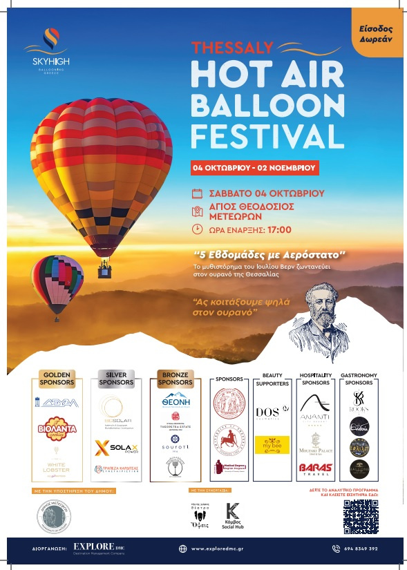 Ο Δήμος Μετεώρων προσκαλεί τους δημότες και τους επισκέπτες σήμερα Σάββατο 4 Οκτωβρίου 2025, στον Άγιο Θεοδόσιο Μετεώρων, σε μια μοναδική γιορτή ουρανού και φαντασίας στο πλαίσιο του Thessaly Hot Air Balloon Festival 2025, με θέμα «Αερόστατα & Ιούλιος Βερν – 5 εβδομάδες με αερόστατο».