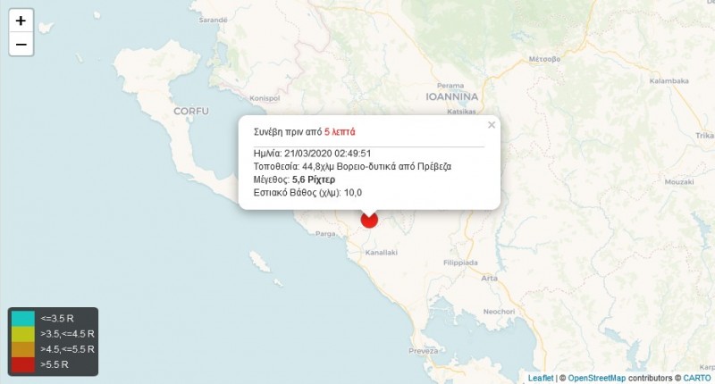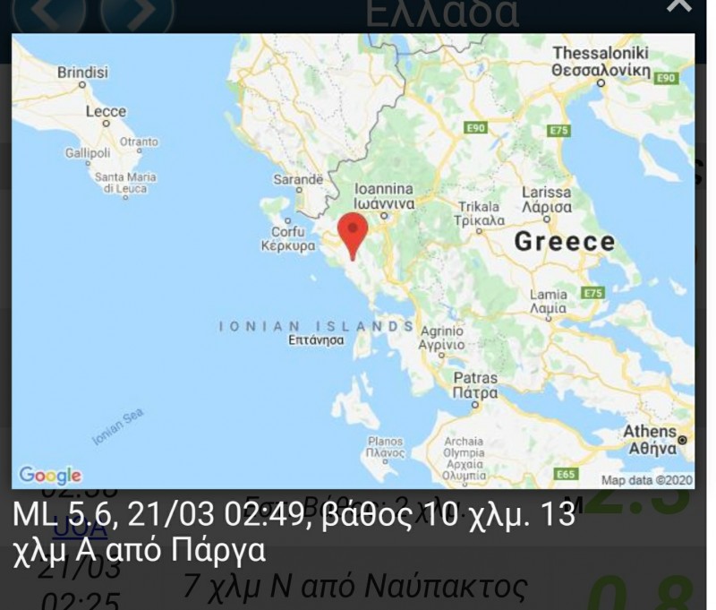 Ισχυρή σεισμική δόνηση μεγέθους 5.6 βαθμών της κλίμακας Ρίχτερ σημειώθηκε απόψε στις 2:49 π.μ. 14 χλμ. Ανατολικά της Πάργας με εστιακό βάθος 10 χλμ.