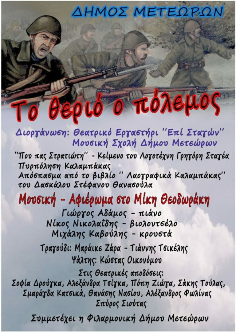 “Το θεριό ο πόλεμος” ήταν το θέμα της εκδήλωσης με κείμενο ( Που πας Στρατιώτη ) του Λογοτέχνη συμπολίτη μας Γρηγόρη Σταγέα, απόσπασμα από το βιβλίο Λαογραφικά του Δάσκαλου Στέφανου Θανασούλα και μουσική αφιέρωμα στον Μίκη Θεοδωράκη.